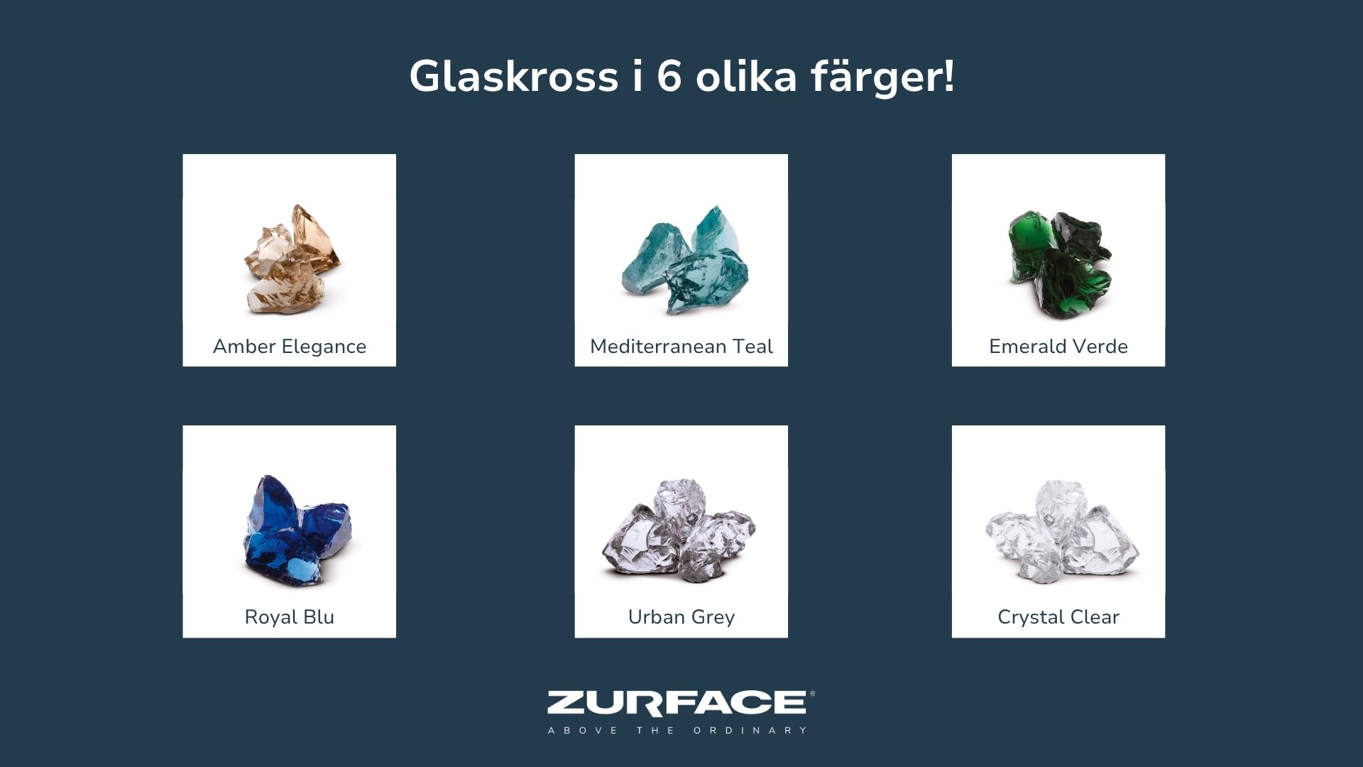 Zurface erbjuder glasgranulat av hög kvalitet för byggnation och design. Vår glaskross används i både inomhus- och utomhusmiljöer. Glaset har en naturlig glans och djup färg som fångar ljuset och ger en elegant karaktär till varje yta.